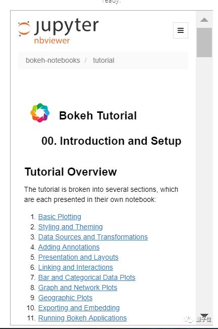 教程是基于Jupyter Notebook提供的,Bokeh本身也与Jupyter Notebook无缝集成,使用起来也比较方便。对于给出的每一个示例,官方也都给出了背后实现的代码。